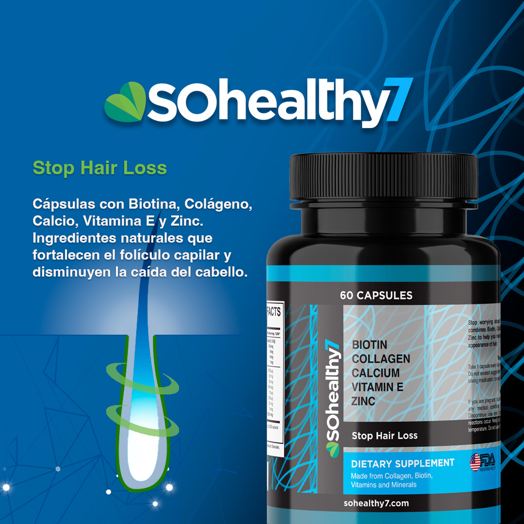 STOP HAIR LOSS de la categoría VITAMINAS Y MINERALES, cuenta con los mejores 5 ingredientes naturales en la dosis ideal para ayudar a tu cuerpo a obtener los mayores beneficios y resultados, estos te ayudarán a mantener tu cabello resistente y una piel saludable: